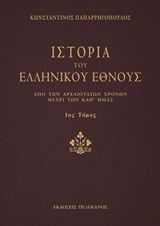 Στο μνημειώδες έργο Ιστορία του ελληνικού έθνους, ο «πατέρας» της ελληνικής ιστοριογραφίας Κωνσταντίνος Παπαρρηγόπουλος καταγράφει την ιστορική συνέχεια της ελληνικής φυλής από τους αρχαίους χρόνους μέχρι σήμερα, προσπαθώντας παράλληλα να αναιρέσει την κυρίαρχη εντύπωση ότι οι χρόνοι του Βυζαντίου υπήρξαν χρόνοι παρακμής και εκφυλισμού. Θεωρεί τη βυζαντινή περίοδο αναπόσπαστο κομμάτι της ελληνικής ιστορίας και καθιερώνει στη διδασκαλία του στο Πανεπιστήμιο Αθηνών την τριμερή διαίρεση της ελληνικής ιστορίας σε αρχαία, μεσαιωνική και νέα. Ο πρώτος τόμος του έργου περιλαμβάνει: Προϊστορικοί χρόνοι. Μύθοι. Ερμηνείαι. Ιστορική του έθνους καταγωγή, Κοινωνική, ηθική και πολιτική κατάστασις του έθνους, Πρώτοι ιστορικοί χρόνοι - Γεωγραφία και ιστορία των δευτερευουσών της Ελλάδος πολιτειών, Κάθοδος των Ηρακλειδών, Σπάρτη, Αθήναι, Αποικίαι. Ηθική ενότης του έθνους, Μηδικοί ή Περσικοί πόλεμοι - Εισαγωγή. Ιώνων επανάστασις, Ο αμυντικός πόλεμος. Στρατηγία της Σπάρτης, Επιθετικός πόλεμος. Ηγεμονία των Αθηναίων, Ακμή ηγεμονίας των Αθηναίων. Μοναρχία Περικλέους, Πελοποννησιακός πόλεμος - Προοίμια του εμφυλίου αγώνος, Ο εμφύλιος μέχρι της Νικείου ειρήνης αγών, Ο εμφύλιος αγών μέχρι της καταλύσεως της ηγεμονίας των Αθηναίων, Παρακμή του πρώτου ελληνισμού - Ηγεμονία της Σπάρτης, Ηγεμονία Θηβαίων, Κατάλυσις του πρώτου ελληνισμού, Κάτοικοι της Ελλάδος. Έποικοι εξ Ανατολής, Επίδρασις των εποίκων. Αχαιοί, Έθνος. Γλώσσα. Γραφή. Τέχνη. Ομηρικά έπη.
