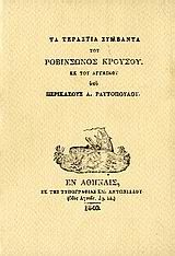 Το γνωστό έργο του Daniel Defoe "Ροβινσώνας Κρούσος" (1719), εκδόθηκε στην Αθήνα το 1840, με τίτλο "Τα τεράστια συμβάντα του Ροβινσώνος Κρούσου", σε δύο τομίδια. Η απόδοση "εκ του αγγλικού", στην καθαρεύουσα της εποχής, έγινε από τον Περικλή Α. Ραυτόπουλο. Το βιβλίο εκδόθηκε με την υποστήριξη πλήθους συνδρομητών από όλη την Ελλάδα και Κέντρα του ελληνισμού. Η γοητευτική μετάφραση του Ραυτόπουλου διασώζει την λόγια γλώσσα της εποχής συνδέοντάς την με ένα σημαντικό έργο της παγκόσμιας λογοτεχνίας. Η αναστατική έκδοση του βιβλίου από τις "Εκδόσεις του Φοίνικα", διατηρεί την τυπογραφική μορφή της έκδοσης του 1840, από το τυπογραφείο του Εμμανουήλ Αντωνιάδη. Στην έκδοση αποτυπώνονται οι εκτυπωτικές αδυναμίες, η έλλειψη τυπογραφικών χαρακτήρων, αλλά και η ζωντάνια των Ελλήνων τυπογράφων στην πρωτεύουσα του νεοσύστατου κράτους. Η βιβλιοδεσία, με επένδυση από χαρτί με υφή μεταξιού, κατασκευασμένο με προβιομηχανικές μεθόδους από τον φλοιό των κλαδιών του θάμνου locta που φύεται στα Ιμαλάια, αντιγράφει δημιουργικά την διακοσμητική των υλικών των βιβλίων ευρείας κυκλοφορίας της εποχής.